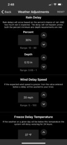 The WeatherSense weather delays will suspend watering when one of three weather delays is activated. WeatherSense has settings that account for rain forecasts, wind speed forecasts, and possible freeze warnings. These thresholds are adjustable by the user and can be accessed in the app on the device details screen. You can get to this screen by selecting the “My B-Hyve” tab at the bottom of the B-Hyve app, tapping on the desired device, then selecting “Weather Adjustments”.