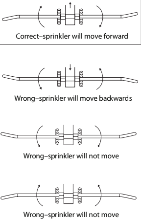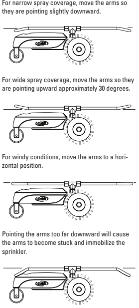 Positioning the spray arms correctly will ensure the proper operation of your sprinkler. Move each spray arm individually to adjust the watering diameter from a minimum of 15 feet to 55 feet. (If the arms are facing the wrong direction, this could cause your sprinkler to travel backwards)