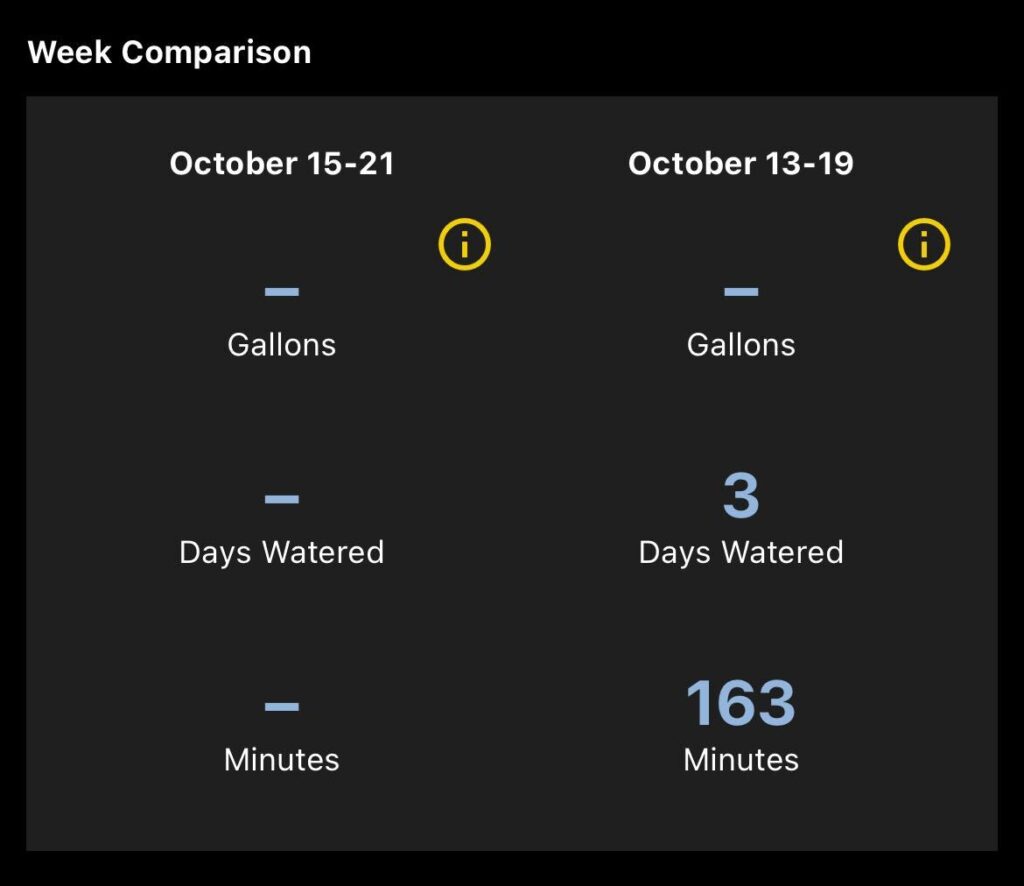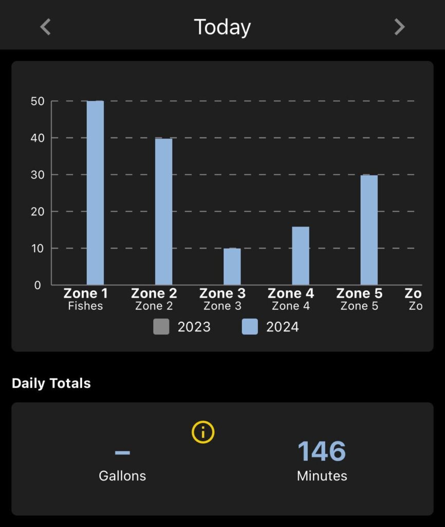 The next section will show the zones and how much each zone has watered (in minutes). You will see the zones with the zone name and number. On the left, you will see the number of gallons (requires a flume meter to show data) and the right will show the number of minutes that ran that day.