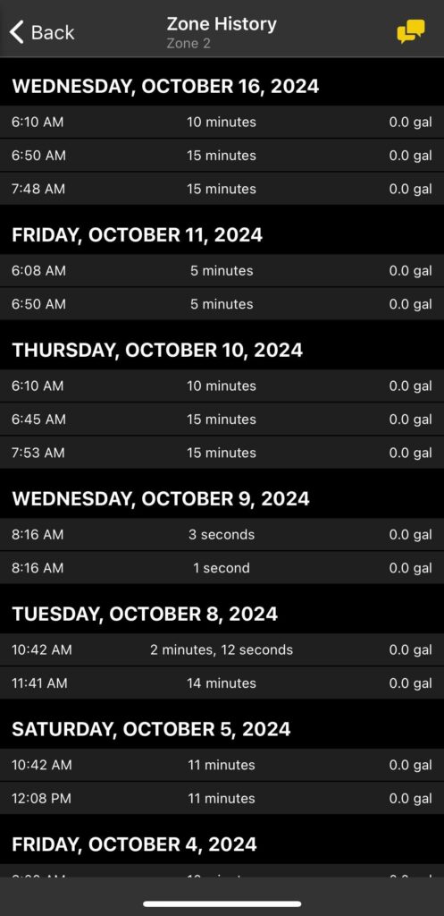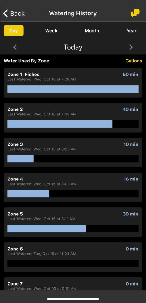 You can tap on the zones to see more details on each zone. This will show each day it ran, what time it started, how long it ran, and how much water it used.